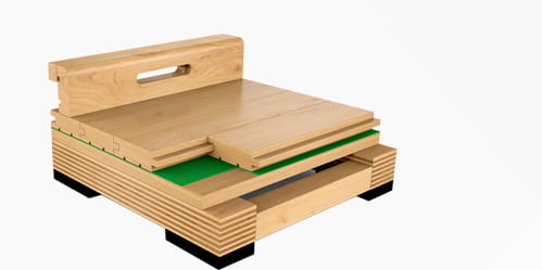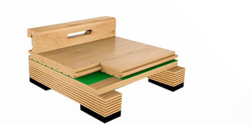 運(yùn)動木地板場地的結(jié)構(gòu)由彈性墊層或彈性結(jié)構(gòu)層、彎曲剛性強(qiáng)的載荷分布層(龍骨或毛地板)、面層(面層地板)三層構(gòu)成。